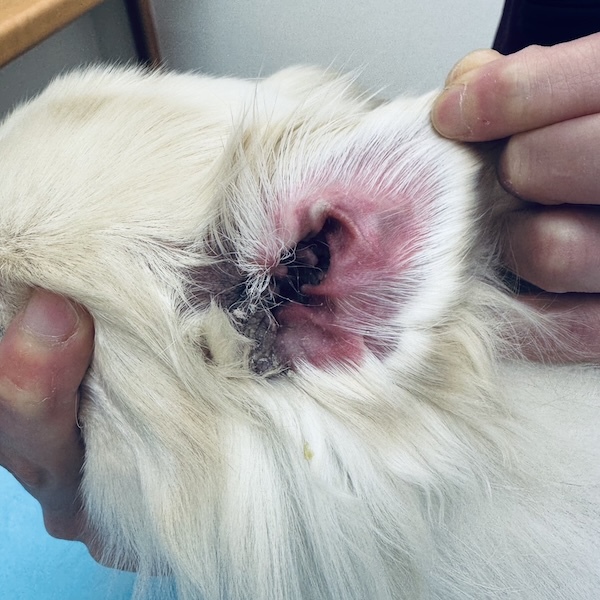 外耳炎は、耳の入口から鼓膜の手前までにあたる"外耳道"と呼ばれる部位に炎症が起きている状態のことを指します。頭をしきりに振る、耳を掻いたり擦り付けたりする、耳の中が赤い、汚れが多い、臭いが強いなどの症状がよく認められます。原因は、アレルギー、細菌などの感染、耳の構造(垂れ耳、耳道が狭い)、高温多湿な環境など多岐に渡ります。これから暖かくなっていくと、症状がよく認められるようになります。慢性化してしまうと、治療が困難となる場合もあります。気になる様子が見受けられる場合には、お早めにご相談ください。