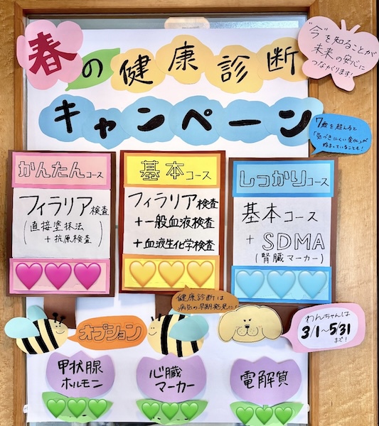 今月より、わんちゃん限定の春の血液検査キャンペーンが始まりました。フィラリア検査を含む全身の血液検査を通常よりもお得な価格で受けていただけます。わんちゃんの1年は、人に換算すると約4〜6年分に相当するため、健康に過ごすには病気の早期発見、早期治療がとても大切です。健康管理の一環として、年に1回、7歳以上のわんちゃんには年2回の血液検査をおすすめしています。キャンペーンは5月末までの期間限定となっておりますので、この機会にぜひご利用ください。